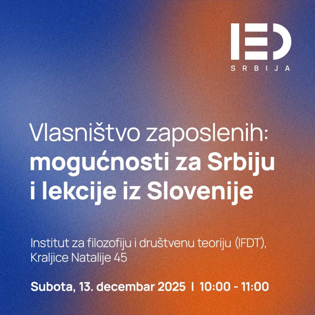 Slovenačka skupština je 23. oktobra usvojila dugo iščekivani Zakon o zadrugama radničkog vlasništva (“Employee Ownership Cooperative Act”), čime je postala prva zemlja u Evropskoj uniji i četvrta u svetu sa posebnim zakonom ove vrste. Ova nova zakonodavna norma pruža osnovu za razvoj vlasništva zaposlenih u većem obimu u Sloveniji i nesumnjivo će nadahnuti i podstaći razvoj i u drugim zemljama. Dr Aleksandra Kanjuo Mrčela, profesorka sociologije rada i ekonomske sociologije na Univerzitetu u Ljubljani i predsednica stručnog odbora Instituta za ekonomsku demokratiju (IED), predstaviće zakon i govoriti o okolnostima njegovog donošenja, očekivanjima, praktičnoj primeni, kao i faktorima koji će doprineti njegovom širokom usvajanju.